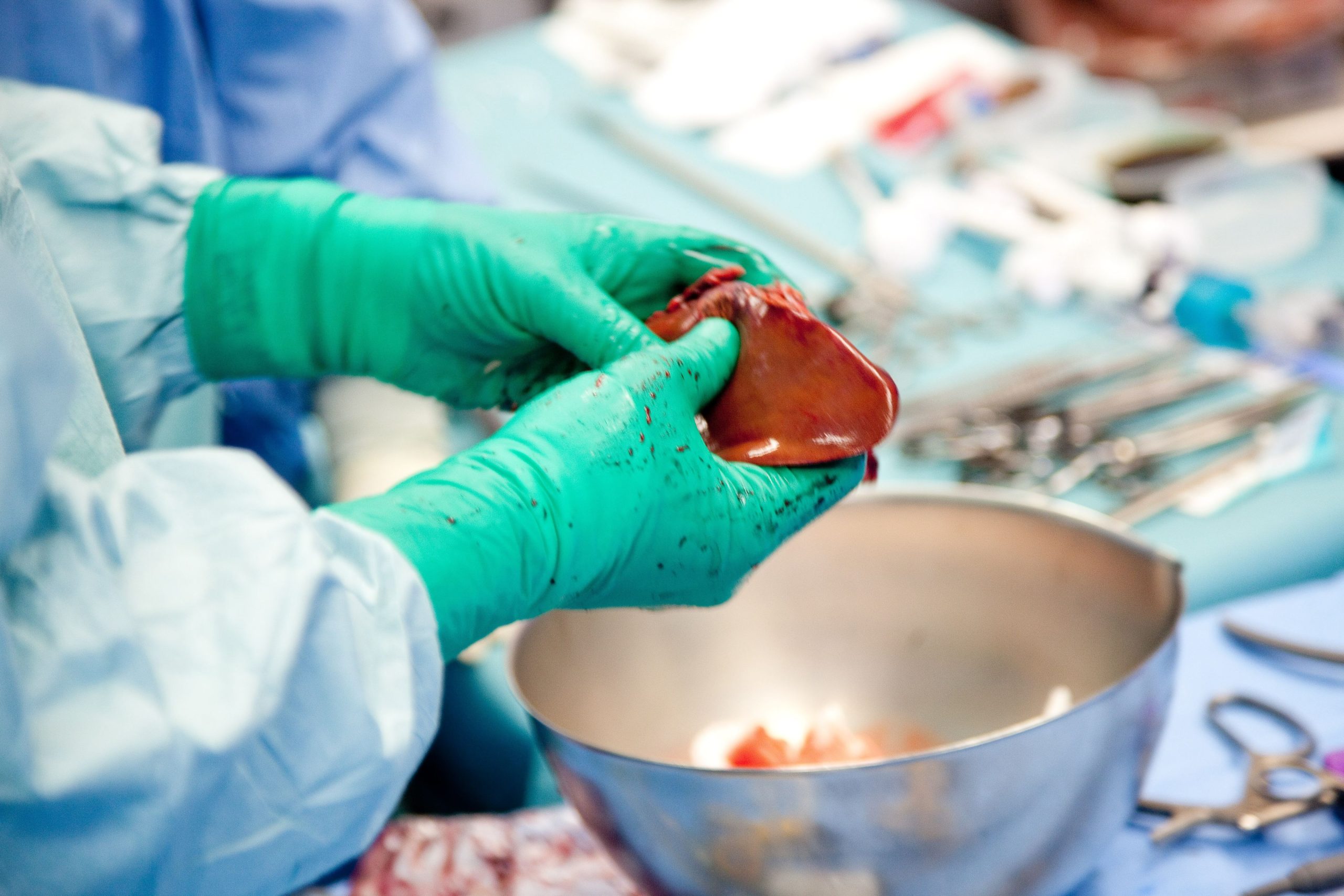 Partial removal of a liver from a living donor by laparoscopy for a transplantation, Here, graft preparation, Department of Surgery of Pr Olivier Soubrane, St Antoine hospital, Paris. Hôpital St Antoine APHP-St ANTOINE-GARO/PHANIE